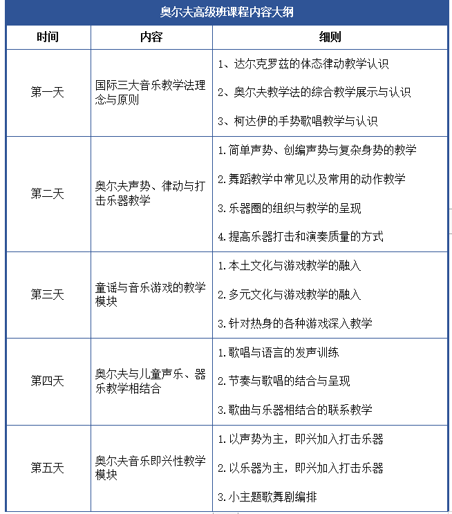 1.学会奥尔夫音乐教学的方法,并能设计多元及有趣的活动2.学会利用引导的方式启发幼儿的各种创意3.学会利用自然环境的素材及随手可得的物品以及生活中的周围事物运用于音乐教学中4.学会活动型的儿歌创作,配合各种主题及幼儿经验,创作出适性幼儿活动的儿歌音乐5.学会如何将多种艺术整合(音乐、舞蹈、故事、戏剧及视觉艺术),让课程更丰富及活泼6.生活处处有音乐,学会就近取材,以即兴的方式进行活动设计